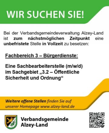 Aktuelle Stellenangebote der VG Alzey-Land; Sachbearbeiterstelle (m/w/d) im Sachgebiet 3.2 – Öffentliche Sicherheit und Ordnung